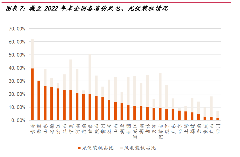 截至 2022 年末,全國各省風(fēng)電、光伏裝機量占各省總裝機量比例前五名的為青 海、西藏、河北、寧夏、安徽(按光伏裝機排序);全國各省風(fēng)電、光伏發(fā)電量占各 省總發(fā)電量比例前五名的為青海、西藏、寧夏、甘肅、山東。 考慮到新能源滲透率與分時電價特征高度相關(guān),因此全國多個省份均可出現(xiàn)類似 山東省的電價分時特征,如青海、寧夏、甘肅等。