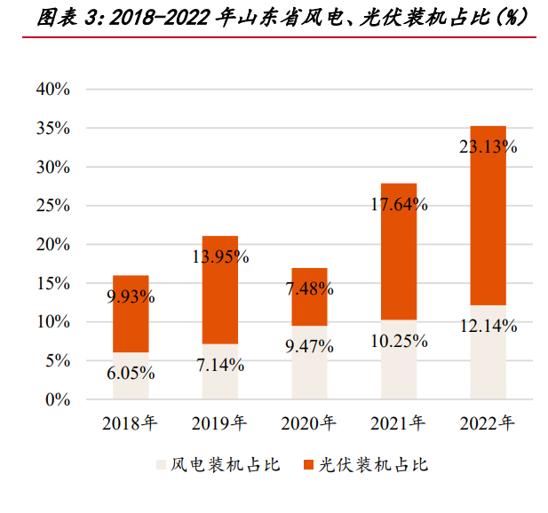 在新能源占比較高的地區(qū),相應(yīng)時段電價較低。由于新能源發(fā)電邊際成本低的特 質(zhì),在新能源高發(fā)期間,如果用電需求較低,則相應(yīng)時段市場電價較低。以山東省電 力現(xiàn)貨市場為例: 2018-2022 年,山東省風(fēng)電、光伏裝機容量及發(fā)電量持續(xù)增長,風(fēng)電、光伏裝機 容量自 1146/1361 萬千瓦增長至 2302/4270 萬千瓦,CAGR 達(dá) 14.97%/25.69%,風(fēng)電、 光伏裝機占總裝機量比例自 6.05%/9.93%擴張至 12.14%/23.13%;風(fēng)電、光伏發(fā)電量 占總發(fā)電量比例自 2.32%/0.55%擴張至 5.28%/11.25%。