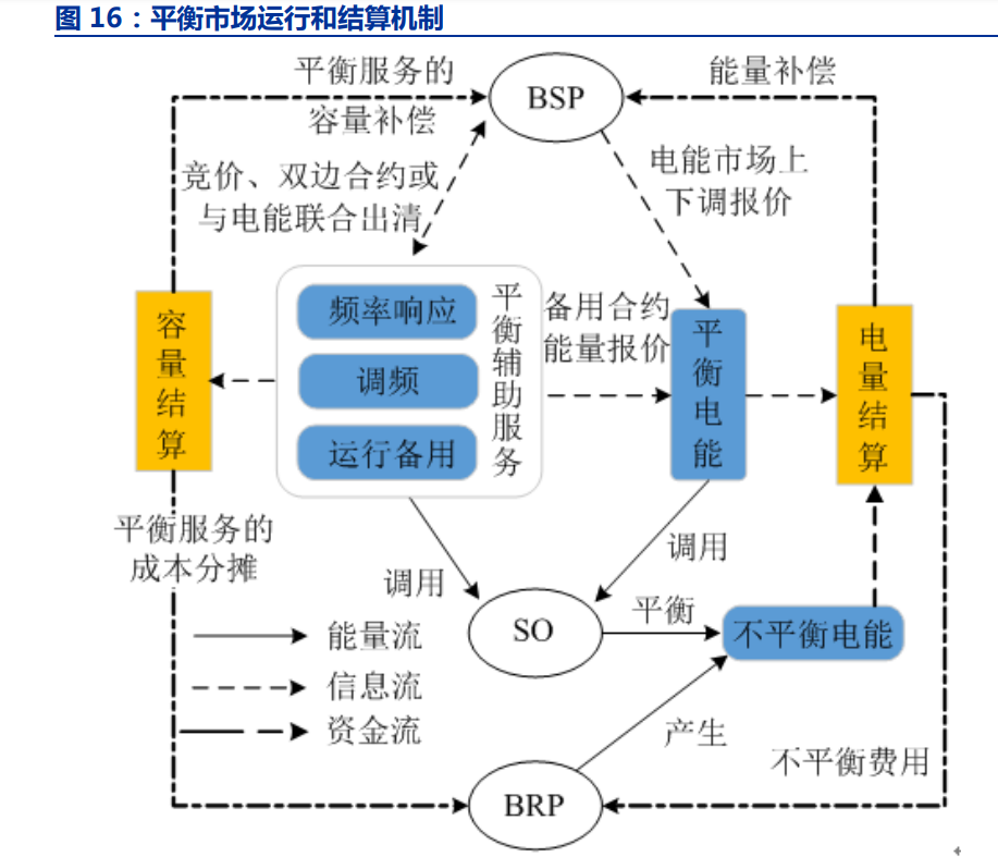 歐洲的平衡市場源于 2017 年 12 月 23 日歐盟委員會 EB 條例,該條例給出一個指導(dǎo) 方針,使得各國可以在平衡市場中共享資源,從而使發(fā)電量始終與用電量相等。從實際達(dá) 成的效果來看,歐洲平衡市場與我國的調(diào)頻輔助服務(wù)類似。 在平衡市場中,調(diào)度智能歸于 TSO 或者 DSO,參與平衡市場運(yùn)行和結(jié)算的市場成員 包括 BSP(BalanceServiceProvider,BSP)和 BRP(BalanceResponsibilityParty,BRP) 等。其中 BSP 提供平衡資源,在實際運(yùn)行中根據(jù)系統(tǒng)頻率變化或調(diào)度指令改變自身出力以 幫助系統(tǒng)恢復(fù)平衡,BRP 是承擔(dān)責(zé)任并參與不平衡結(jié)算的市場成員。