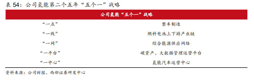 率先布局氫能全產(chǎn)業(yè)鏈,全面啟動“五個一”戰(zhàn)略。公司于 2017 年在氫能產(chǎn)業(yè)鏈領(lǐng)先廣 泛布局,至 2021 年完成氫能發(fā)展的第一個五年規(guī)劃,目前已經(jīng)搭建了上游氫氣的“制-儲運(yùn)-加”氫能供應(yīng)體系、中游“膜電極-燃料電池電堆及系統(tǒng)-整車制造”核心裝備產(chǎn)業(yè)鏈,以及 下游六大區(qū)域氫能示范應(yīng)用的三 維格局,形成從研發(fā)—生產(chǎn)制造—商業(yè)化應(yīng)用的“氫能源 全生命周期”創(chuàng)新生態(tài)鏈。2022 年,公司啟動氫能產(chǎn)業(yè)第二個五年計劃,確立“五個一”戰(zhàn) 略。