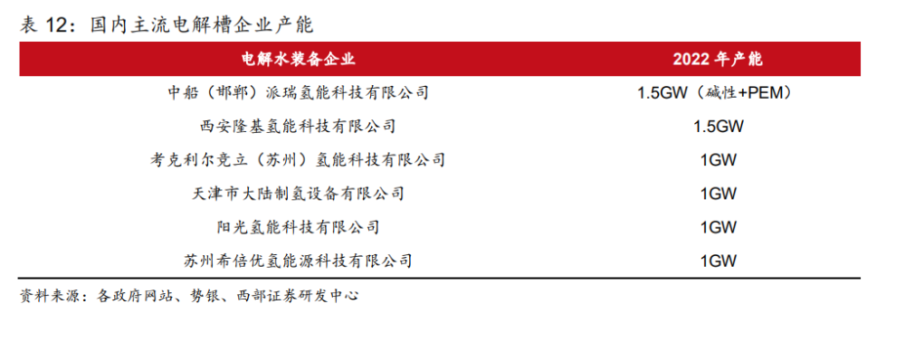 電解水制氫是指水分子在直流電作用下被解離生成氧氣和氫氣,分別從電解槽陽極和陰極 析出。根據(jù)工作原理和電解質的不同,電解水制氫技術通常分為四種,分別是堿性電解水 技術(ALK)、質子交換膜電解水技術(PEM)、高溫固體氧化物電解水技術(SOEC)和 固體聚合物陰離子交換膜電解水技術(AEM)。 電解水制氫技術以堿性電解為主,PEM 電解次之。“雙碳”目標提出后,國內電解水制氫 項目規(guī)劃和推進逐步加快,2022 年國內堿性電解槽企業(yè)已披露產(chǎn)能接近 11GW,堿性電 解水制氫技術已完成商業(yè)化進程,產(chǎn)業(yè)鏈發(fā)展成熟,且具備成本優(yōu)勢,已實現(xiàn)大規(guī)模應用; PEM 電解水技術則處于商業(yè)化初期,產(chǎn)業(yè)鏈國產(chǎn)化程度不足,電解槽雙極板、膜材料以及 鉑、銥等貴金屬催化劑材料成本更高且極度依賴進口;高溫固體氧化物電解水技術和固體 聚合物陰離子交換膜電解水技術還處于研發(fā)示范階段,未實現(xiàn)商業(yè)化應用。