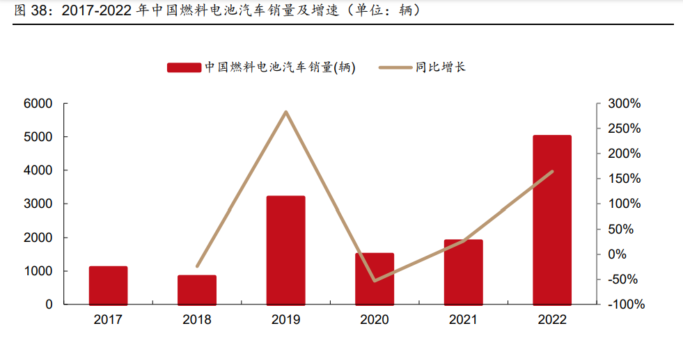 中國(guó)燃料電池汽車(chē)銷量增速明顯,商用車(chē)占據(jù)主導(dǎo)地位。2016-2019 年我國(guó)燃料電池汽 車(chē)銷量持續(xù)增長(zhǎng),2020 年受疫情和補(bǔ)貼政策退坡等因素的影響,燃料電池汽車(chē)銷量出現(xiàn) 下降,而在 2021 年燃料電池汽車(chē)銷量恢復(fù)增長(zhǎng),到 2022 年底,我國(guó)燃料電池汽車(chē)銷量 達(dá)到 5006 輛,同比增長(zhǎng) 164.17%。國(guó)內(nèi)燃料電池汽車(chē)保有量持續(xù)增長(zhǎng),2022 年達(dá)到 12306 輛,同比增長(zhǎng) 37.68%。根據(jù)《中國(guó)氫能產(chǎn)業(yè)發(fā)展報(bào)告 2022》,預(yù)計(jì)至 2025 年,中國(guó)燃料 電池汽車(chē)保有量將發(fā)展到 5-10 萬(wàn)輛,預(yù)計(jì)至 2030 年,燃料電池汽車(chē)將實(shí)現(xiàn)商業(yè)化運(yùn)營(yíng)。 從車(chē)型類別來(lái)看,2022 年,我國(guó)燃料電池汽車(chē)銷量中,商用車(chē)占據(jù)主導(dǎo)地位,乘用車(chē)占比 僅為 4.47%。根據(jù)國(guó)際能源署統(tǒng)計(jì)數(shù)據(jù),在國(guó)內(nèi)燃料電池客車(chē)和商用車(chē)政策推動(dòng)下,我國(guó) 在全球燃料電池公交車(chē)和商用車(chē)領(lǐng)域中占據(jù)主導(dǎo)地位。
