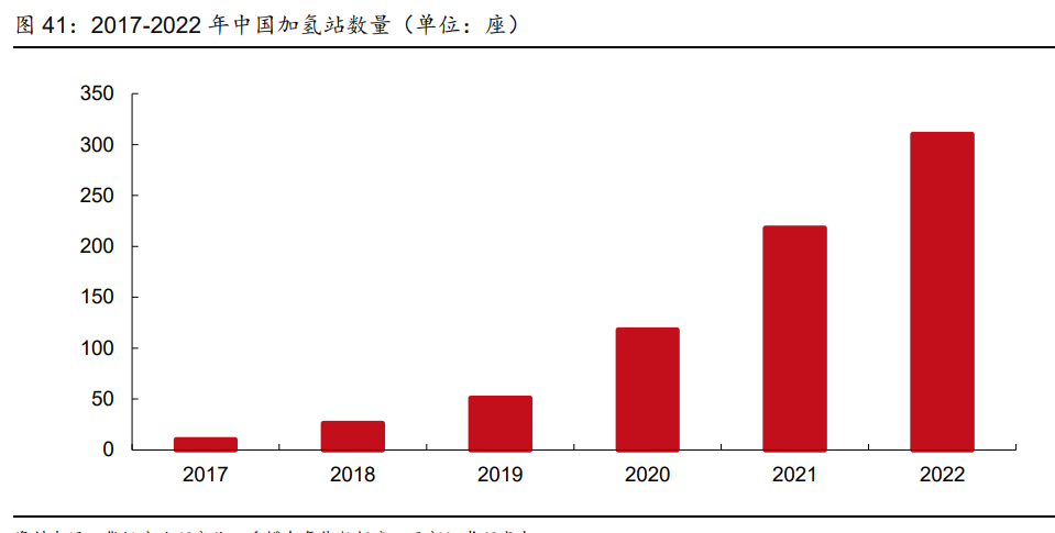 加氫站布局加快,逐漸形成網(wǎng)絡(luò)。加氫站等基礎(chǔ)設(shè)施是否完善是影響消費(fèi)者購(gòu)買(mǎi)氫燃料電 池汽車(chē)熱情的主要因素。隨著國(guó)內(nèi)氫燃料電池汽車(chē)?yán)塾?jì)銷量增加,中石化、中石油等能源 央企不斷加大加氫基礎(chǔ)設(shè)施的投資和建設(shè)力度,國(guó)內(nèi)加氫站數(shù)量呈現(xiàn)快速增長(zhǎng)趨勢(shì)。截至 2022 年底,我國(guó)加氫站累計(jì)建成數(shù)量達(dá)到 274 座。根據(jù) 2020 年中國(guó)汽車(chē)工程學(xué)會(huì)發(fā)布 的《節(jié)能與新能源汽車(chē)技術(shù)路線圖 2.0》相關(guān)規(guī)劃,到 2035 年加氫站的建設(shè)目標(biāo)為至少 5000 座,中國(guó)未來(lái)加氫基礎(chǔ)設(shè)施的市場(chǎng)規(guī)模在 2030-2050 年將突破千億。此外,我國(guó)加 氫站建設(shè)參與主體呈現(xiàn)多樣化趨勢(shì),采取規(guī)?;ㄔO(shè)或加油/加氫/加氣站合建等方式來(lái)拓 展加氫基礎(chǔ)設(shè)施網(wǎng)絡(luò),單位加注成本也有望下降。