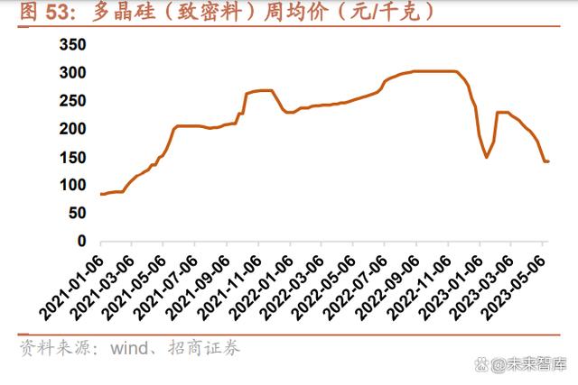硅料價(jià)格持續(xù)下降,新建產(chǎn)能規(guī)模龐大,有望推動(dòng)光伏裝機(jī)進(jìn)一步增長。2022 年 12 月開始,隨著硅料產(chǎn)能的逐步釋 放,多晶硅和組件價(jià)格開始大幅回落。2023 年 2 月,硅料價(jià)格出現(xiàn)輕微反彈,主要系需求回暖+開工補(bǔ)庫所致,目前 已重新進(jìn)入下行通道。截至 2023 年 5 月 17 日,多晶硅(致密料)價(jià)格為 143 元/千克,相較 2022 年 11 月 30 日的 高點(diǎn) 295 元/千克下降 51.53%;單面單晶 PERC 組件價(jià)格(182mm)為 1.66 元/瓦,相較 2022 年 11 月 23 日的高 點(diǎn) 1.97 元/瓦下降 15.74%。硅業(yè)分會表示,2023 年國內(nèi)多晶硅產(chǎn)量保守估計(jì)有 146 萬噸,加上進(jìn)口多晶硅可達(dá) 156 萬噸,這些硅料已經(jīng)足夠 600GW 光伏裝機(jī),已遠(yuǎn)超 2023 年的全球光伏裝機(jī)量需求,過剩的產(chǎn)能有望推動(dòng)硅料和組 件價(jià)格進(jìn)一步下行,提升運(yùn)營商的裝機(jī)意愿。