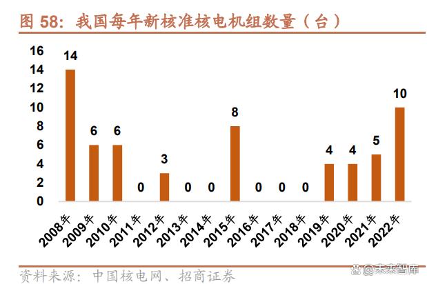 2021 年國家首次提出“積極有序發(fā)展核電”。同年,我國新增 5 臺核準(zhǔn)機(jī)組;2022 年新核準(zhǔn) 10 臺機(jī)組,核電審批和 開工節(jié)奏明顯提速。根據(jù)世界核協(xié)會,截至 2023 年 5 月,我國在運(yùn)+在建機(jī)組總數(shù)達(dá)到 77 臺,已經(jīng)超過法國,僅次 于美國。預(yù)計(jì)在未來 5 年間,中國將進(jìn)一步加快擴(kuò)大裝機(jī)規(guī)模,保持每年 6 至 8 臺核電機(jī)組的核準(zhǔn)開工節(jié)奏。