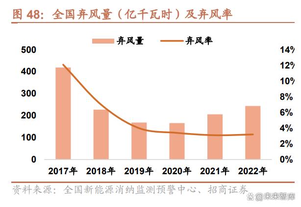 風(fēng)光消納問題改善明顯,平均棄風(fēng)率整體回落。2017 年我國棄風(fēng)率和其光率分別高達(dá) 12.1%和 6.0%。近年來隨著可 再生能源發(fā)電消納保障措施不斷落地以及電力系統(tǒng)靈活性改造加速,棄風(fēng)率、棄光率逐漸回落。自 2019 年以來,全 國棄風(fēng)率維持在 4%以下,國家電網(wǎng)基本實(shí)現(xiàn)了將棄風(fēng)率控制在 5%的目標(biāo)。2023 年 3 月,全國風(fēng)電利用率為 96.8%, 光伏發(fā)電利用率為 98.2%;1-3 月,全國風(fēng)電利用率達(dá) 96.8%,上海、江蘇、浙江、安徽、福建、重慶、四川等 12個(gè)省市風(fēng)電利用率達(dá) 100%;光伏利用率達(dá) 98.0%,棄光率同比下降 0.8pct。