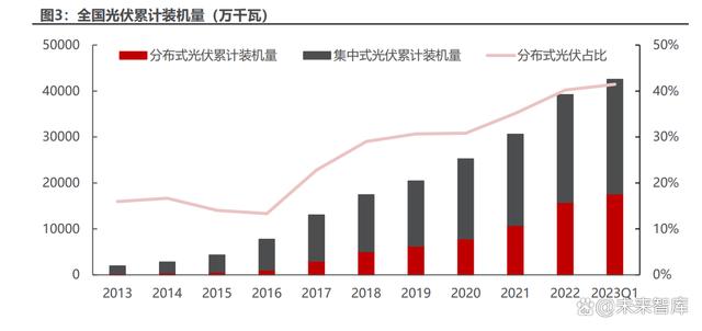 我國(guó)分布式光伏累計(jì)裝機(jī)占比逐漸提升。相比于集中式光伏,分布式光伏規(guī)模 較小、輸出電壓功率較小且更接近用戶側(cè),具有投資小、建設(shè)快、占地面積小等優(yōu) 勢(shì)。截至 2022 年底,中國(guó)光伏累計(jì)裝機(jī)量達(dá) 392GW,其中分布式光伏累計(jì)裝機(jī) 量達(dá) 158GW,占比 40%。