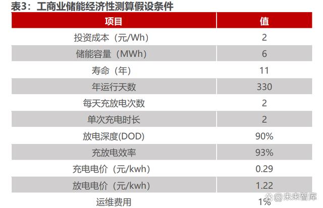 工商業(yè)儲(chǔ)能經(jīng)濟(jì)性測(cè)算假設(shè)條件:1)項(xiàng)目案例:浙江 3MW/6.88MWh 用戶 側(cè)儲(chǔ)能系統(tǒng)項(xiàng)目,假設(shè)工廠白天負(fù)荷穩(wěn)定可完全消納儲(chǔ)能放電,且變壓器容量滿足 儲(chǔ)能充電需求;2)項(xiàng)目成本拆分:我們假設(shè)工商業(yè)儲(chǔ)能項(xiàng)目整體投資成本為 2 元 /Wh,其中電池占比 55%,集裝箱占比 15%,BMS 占比 7%;3)運(yùn)行模式:考 慮工廠休息及設(shè)備檢修,儲(chǔ)能設(shè)備每年運(yùn)行 330 天,每天進(jìn)行兩次充放電。第一 次在夜間谷價(jià)充電,在上午尖峰電價(jià)放電 2 小時(shí);第二次在午間谷價(jià)充電 2 小時(shí), 在下午尖峰電機(jī)放電 2 小時(shí);4)峰谷價(jià)差:參考浙江工商業(yè)峰谷電價(jià),假設(shè)尖峰 電價(jià) 1.22 元/KWh,低谷電價(jià) 0.29 元/KWh,峰谷價(jià)差為 0.93 元/KWh。