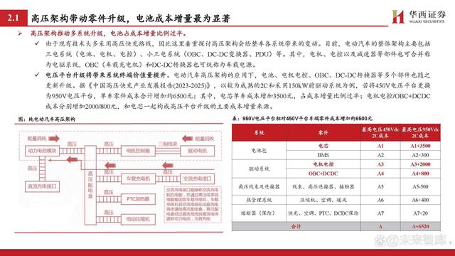 高壓架構推動多系統(tǒng)升級,電池占成本增量比例過半。 由于現(xiàn)有技術大多采用高壓快充路線,因此這里著重探討高壓架構會給整車各系統(tǒng)帶來的變動。目前,電動汽車的整體架構主要包括 三電系統(tǒng)(電池、電機、電控)、小三電系統(tǒng)(OBC、DC-DC變換器、PDU)等。其中,電機、電控以及減速器等部件也可合并稱 為電驅系統(tǒng),OBC(車載充電機)和DC-DC轉換器也可統(tǒng)稱為車載電源。 電壓平臺升級將帶來系統(tǒng)終端價值量提升。電動汽車高壓架構的應用下,電池、電機電控、OBC、DC-DC轉換器等多個部件也隨之 更新升級。據(jù)《中國高壓快充產(chǎn)業(yè)發(fā)展報告(2023-2025)》,以較為成熟的2C和采用150kW前驅動系統(tǒng)為例,若將450V電壓平臺更換 為950V電壓平臺,單車零件成本合計增加約6500元;其中,電芯單車成本增加3500元,占成本增量比例過半;電機電控/OBC+DCDC 成本分別增加2000/800元,和電芯一起構成高壓平臺升級的主要成本增量來源。