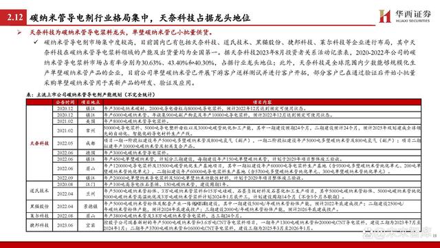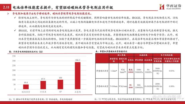 導電劑加速離子&電子移動速率,碳納米管較常規(guī)導電劑性能更優(yōu)。除鋰電池主材外,導電劑作為鋰電池的材料構成中的關鍵輔材,同樣影響著鋰電池的倍率性能。據(jù)GGII,導電劑在活性物質之間、活性 物質與集流體之間起到收集微電流的作用,以減小電極的接觸電阻并加速電子的移動速率,同時也能有效提高鋰離子在電極材料中的遷 移速率,從而提高電極的充放電效率。 據(jù)GGII,目前市場上應用的鋰電池導電劑包括以炭黑、導電石墨為代表的常規(guī)導電劑和以碳納米管、石墨烯為代表的新型導電劑。據(jù)天 奈科技招股書,相較于常規(guī)導電劑的代表炭黑,碳納米管具有更好的導電性能,并能夠使鋰電池保持良好的電子和離子傳導;此外,碳 納米管憑借其較高長徑比的特性,相較于炭黑能夠進一步提高鋰電池的倍率性能。據(jù)GGII預計,在高倍率電池需求增加等因素的推動下, 新型導電劑將在未來幾年逐步替代傳統(tǒng)導電劑,其中碳納米管有望成為市場主流。此外,碳納米管一般分為單壁和多壁碳納米管,單壁 碳納米管因為長徑比更大,從而擁有更優(yōu)的理化性能和導電性能,有望成為碳納米管未來的重點發(fā)展方向。