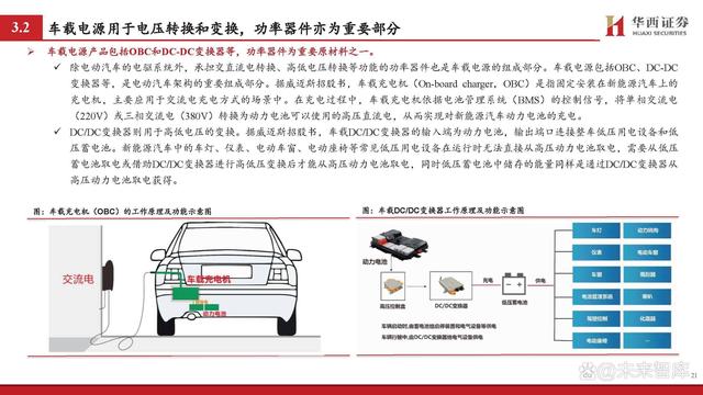 車載電源產(chǎn)品包括OBC和DC-DC變換器等,功率器件為重要原材料之一。 除電動汽車的電驅系統(tǒng)外,承擔交直流電轉換、高低電壓轉換等功能的功率器件也是車載電源的組成部分。車載電源包括OBC、DC-DC 變換器等,是電動汽車架構的重要組成部分。據(jù)威邁斯招股書,車載充電機(On-board charger,OBC)是指固定安裝在新能源汽車上的 充電機,主要應用于交流電充電方式的場景中。在充電過程中,車載充電機依據(jù)電池管理系統(tǒng)(BMS)的控制信號,將單相交流電 (220V)或三相交流電(380V)轉換為動力電池可以使用的高壓直流電,從而實現(xiàn)對新能源汽車動力電池的充電。 DC/DC變換器則用于高低電壓的變換。據(jù)威邁斯招股書,車載DC/DC變換器的輸入端為動力電池,輸出端口連接整車低壓用電設備和低 壓蓄電池。新能源汽車中的車燈、儀表、電動車窗、電動座椅等常見低壓用電設備在運行時無法直接從高壓動力電池取電,需要從低壓 蓄電池取電或借助DC/DC變換器進行高低壓變換后才能從高壓動力電池取電,同時低壓蓄電池中儲存的能量同樣是通過DC/DC變換器從 高壓動力電池取電獲得。