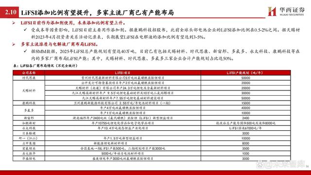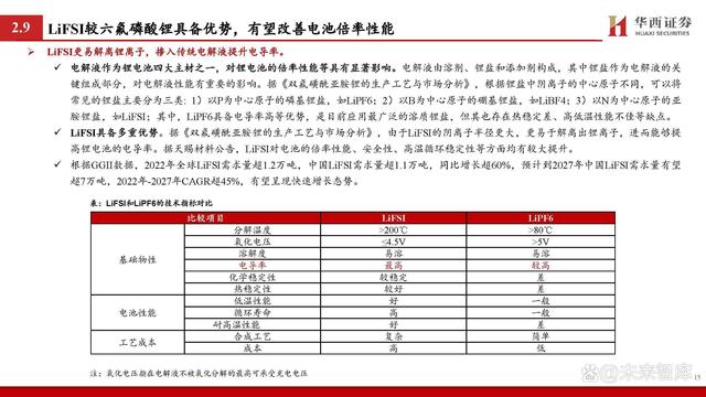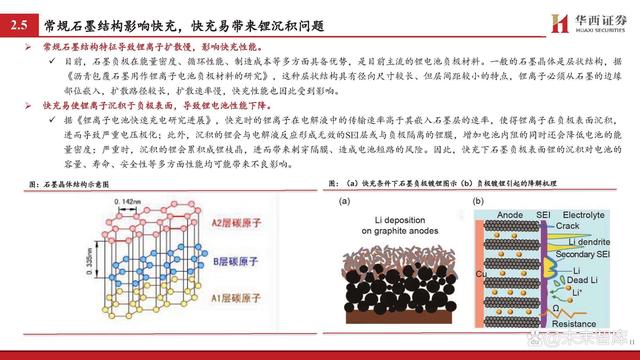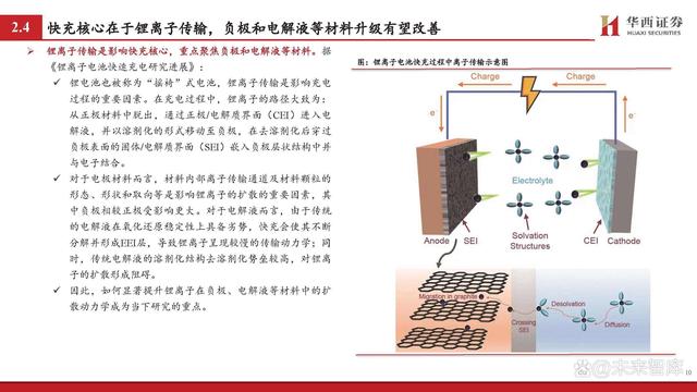 鋰離子傳輸是影響快充核心,重點聚焦負極和電解液等材料。據(jù) 《鋰離子電池快速充電研究進展》: 鋰電池也被稱為“搖椅”式電池,鋰離子傳輸是影響充電 過程的重要因素。在充電過程中,鋰離子的路徑大致為: 從正極材料中脫出,通過正極/電解質界面(CEI)進入電 解液,并以溶劑化的形式移動至負極,在去溶劑化后穿過 負極表面的固體/電解質界面(SEI)嵌入負極層狀結構中并 與電子結合。 對于電極材料而言,材料內部離子傳輸通道及材料顆粒的 形態(tài)、形狀和取向等是影響鋰離子的擴散的重要因素,其 中負極相較正極受影響更大。對于電解液而言,由于傳統(tǒng) 的電解液在氧化還原穩(wěn)定性上具備劣勢,快充會使其不斷 分解并形成EEI層,導致鋰離子呈現(xiàn)較慢的傳輸動力學;同 時,傳統(tǒng)電解液的溶劑化結構去溶劑化勢壘較高,對鋰離 子的擴散形成阻礙。 因此,如何顯著提升鋰離子在負極、電解液等材料中的擴 散動力學成為當下研究的重點。