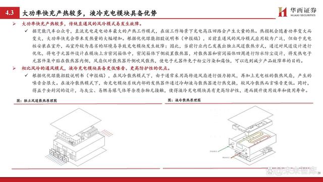 大功率快充產(chǎn)熱較多,傳統(tǒng)直通風的風冷模式易發(fā)生故障。據(jù)芝能汽車公眾號,直流充電是電動車最大的產(chǎn)熱工作模式,在該工作場景下充電高壓回路會產(chǎn)生大量的熱。熱損耗會隨著功率變大而 變大,大功率快充會帶來發(fā)熱量的大幅增加。根據(jù)優(yōu)優(yōu)綠能招股說明書(申報稿),目前直通風的風冷模式應用較為廣泛,但由于充電 樁安裝在室外,而室外較為惡劣的環(huán)境易導致充電模塊發(fā)生故障;因此,當前行業(yè)內已發(fā)展出獨立風道散熱方式,通過對風道設計進行 優(yōu)化,將電子元器件設計在模塊上方密閉箱體中,密閉箱體下側放置散熱器,對散熱器和密閉箱體四周進行防水防塵設計,將發(fā)熱電子 元器件集中貼在散熱器內側,風扇僅對散熱器外側吹風散熱,使電子元器件免于粉塵污染和腐蝕,可以達到減少產(chǎn)品故障率的目的。