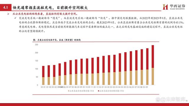 從公共充電樁的結構來看,直流樁仍有較大提升空間。 交流充電系統(tǒng)一般被稱為“慢充”,而直流充電系統(tǒng)一般被稱為“快充”。據(jù)中國充電聯(lián)盟數(shù)據(jù),從2022年到2023年9月,直流公共充 電樁的占比整體保持穩(wěn)定,且總體低于交流公共充電樁的占比;截至2023年9月,公共直流樁保有量占公共充電樁保有量的比例為43.1%。 考慮到充電難、充電慢依然是當前使用新能源汽車過程中需要解決的痛點之一,在之后的充電基礎設施的建設過程中,直流公共充電樁 的占比有望持續(xù)提升。