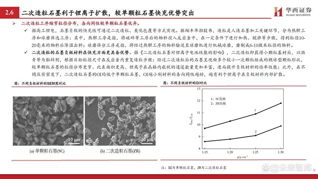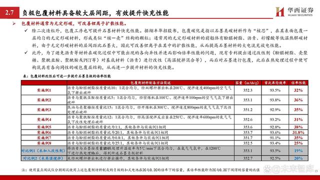 包覆材料通常為無定形碳,可改善鋰離子擴散性能。 除二次造粒外,包覆工序也可提升石墨材料快充性能。據(jù)翔豐華招股書,包覆碳化是指以石墨類碳材料作為“核芯”,在其表面包覆一 層均勻的無定形碳材料,形成類似“核-殼”結構的顆粒;通常用的無定形碳材料的前軀體有酚醛樹脂、瀝青、檸檬酸等低溫熱解碳材 料,由于無定形碳材料的層間距比石墨大,因此可改善鋰離子在其中的擴散性能,從而提高石墨材料的大電流充放電性能。 此外,為了避免瀝青等材料在碳化過程中可能出現(xiàn)的各向異性并進而影響倍率性能的問題,現(xiàn)有專利提出通過改性劑(酚醛樹脂、殼聚 糖、聚酰亞胺、聚酰胺或PET等)對基底材料(瀝青)進行改性(高溫攪拌混合等),而后對石墨進行包覆,此后在熱處理過程中便可 構筑具有各向同性的碳包覆層結構,從而進一步提升材料的快充性能。