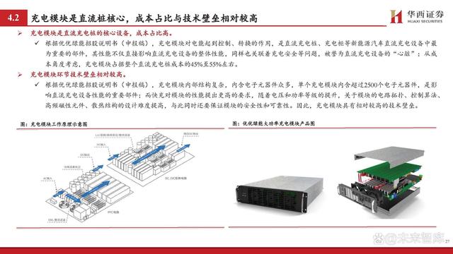 充電模塊是直流充電樁的核心設備,成本占比高。 根據(jù)優(yōu)優(yōu)綠能招股說明書(申報稿),充電模塊對電能起到控制、轉換的作用,是直流充電樁、充電柜等新能源汽車直流充電設備中最 為重要的部件,其性能不僅直接影響直流充電設備的整體性能,同樣也關聯(lián)著充電安全等問題,被譽為直流充電設備的“心臟”;從成 本角度考慮,充電模塊占據(jù)整個直流充電樁成本的45%至55%左右。