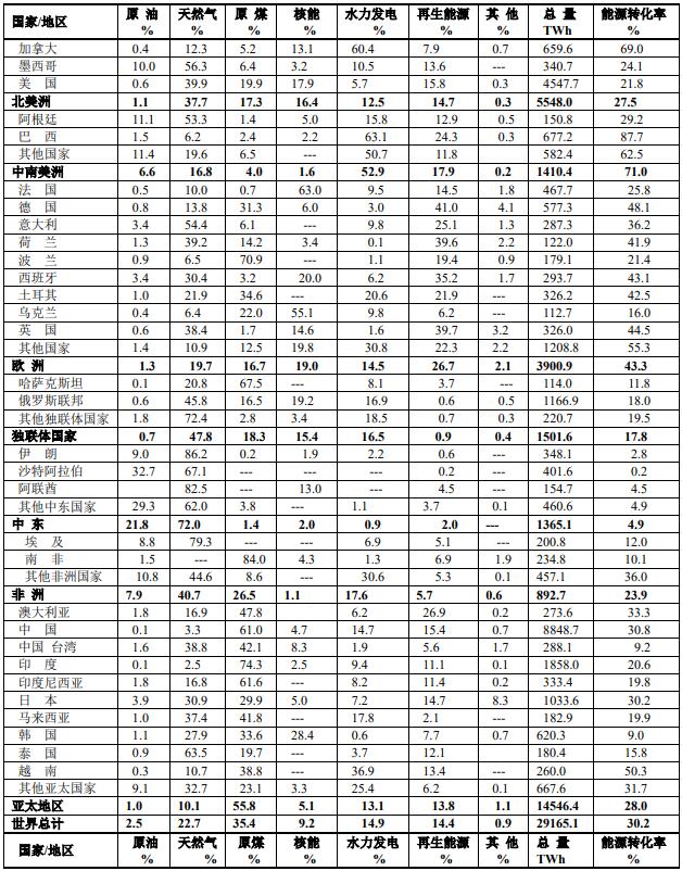 表2、 2022年世界各國電力結(jié)構(gòu)(以%表示)
