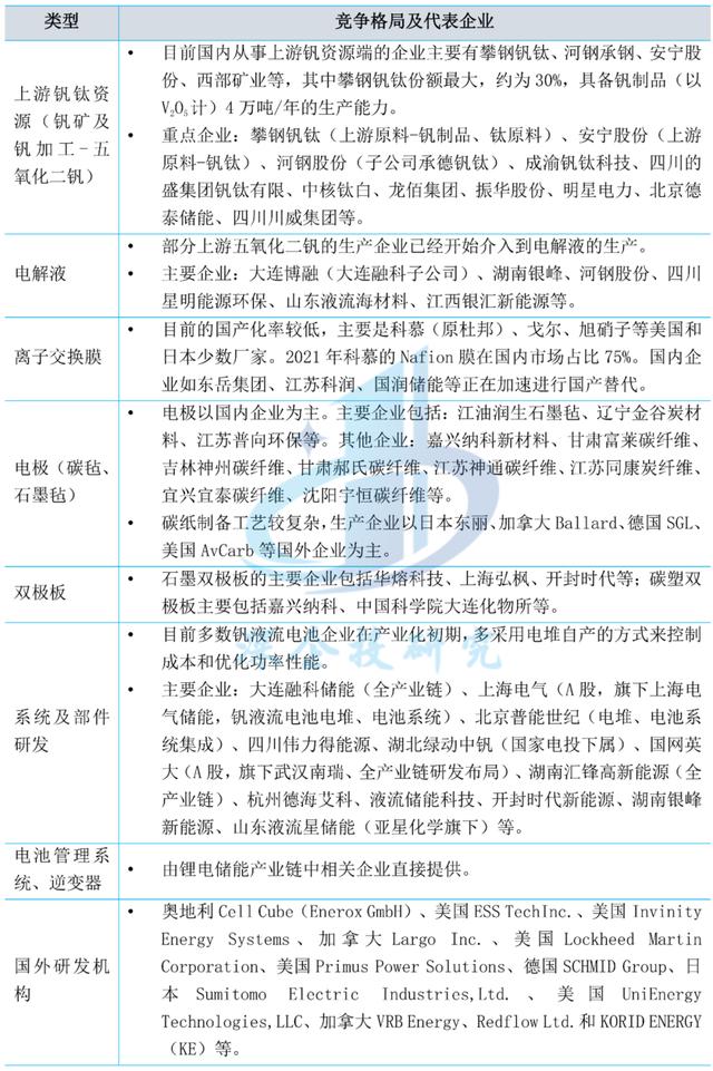 當前國內(nèi)全釩液流電池市場總體體量較小,龍頭格局未顯,產(chǎn)業(yè)仍處于發(fā)展初期。產(chǎn)業(yè)鏈各環(huán)節(jié)的競爭格局和代表企業(yè)如下表所示。