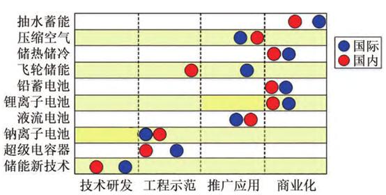 從各類儲能技術(shù)的研發(fā)推廣進程看,目前我國儲能技術(shù)基本上與國際先進水平并跑,壓縮空氣儲能、儲熱儲冷、鉛蓄電池、鋰離子電池、液流電池和鈉離子電池技術(shù)已達到或接近世界先進水平;抽水蓄能、飛輪儲能、超級電容和儲能新技術(shù)與世界先進水平還有一定的差距,如下圖所示。