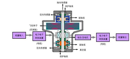 ——工作原理。飛輪儲能的原理是利用過剩電力給真空外殼中的轉(zhuǎn)子(飛輪)加速,把電能以動能的形式儲存。在儲能階段,通過電動機拖動飛輪,使飛輪本體加速到一定的轉(zhuǎn)速,將電能轉(zhuǎn)化為動能;在能量釋放階段,飛輪的旋轉(zhuǎn)速度會降低,電動機作發(fā)電機運行,將動能轉(zhuǎn)化為電能。一般來說,飛輪系統(tǒng)使用電流來控制飛輪速度,其中高能的飛輪使用高強度碳纖維制成的轉(zhuǎn)子,并通過磁懸浮軸承實現(xiàn)懸浮。這些轉(zhuǎn)子在真空罩內(nèi)的轉(zhuǎn)速可達到20000-50000rpm,可以在幾分鐘內(nèi)達到所需的速度。