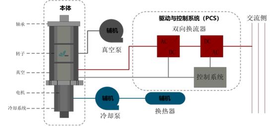 產(chǎn)業(yè)鏈上游。典型的飛輪儲能系統(tǒng)基本結(jié)構(gòu)包括5個部件:1)飛輪本體,一般為高強度復(fù)合纖維材料(如碳纖維復(fù)合材料)制成;2)軸承,為轉(zhuǎn)子提供低耗損支撐,利用非接觸式的永磁軸承、電磁軸承或超導懸浮軸承等支承飛輪;3)電機,一般為電動/發(fā)電互逆式雙向電機(電動機+發(fā)電機);4)電力轉(zhuǎn)換器,是輸入電能轉(zhuǎn)化為直流電供給電機,輸出電能進行調(diào)頻、整流后供給負載的關(guān)鍵部件;5)真空器(真空室),為減少空氣阻力,飛輪系統(tǒng)放置于高真空密封套筒內(nèi)。上游部件主要由華陽股份、國機重裝、湘電股份、廣大特材等企業(yè)提供。產(chǎn)業(yè)鏈中游為飛輪儲能系統(tǒng)集成,主要設(shè)備廠商也同時參與。下游為發(fā)電側(cè)、電網(wǎng)測的業(yè)主單位。