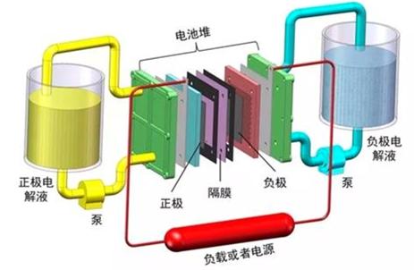 ——工作原理。液流電池通過離子選擇膜的離子交換將化學能轉(zhuǎn)化為電能,離子選擇膜將兩種液體電解質(zhì)分開存儲在不同的罐中,利用兩種化學溶液進行離子交換來進行充放電,其電壓一般在1.0-2.2V之間。與其它電池相似,液流電池的功率與隔膜面積成正比,而儲存能量的多寡和溶液儲存容量成正比。