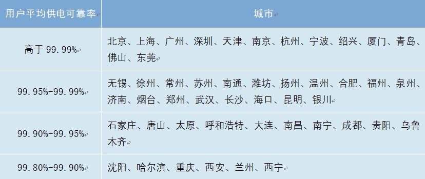 2023年,全國(guó)50個(gè)主要城市供電可靠性繼續(xù)保持較高水平,其中,北京、上海、廣州、深圳、天津、南京、杭州、寧波、紹興、廈門、青島、佛山、東莞用戶平均供電可靠率高于99.99%;長(zhǎng)春、拉薩用戶平均供電可靠率低于99.90%。
