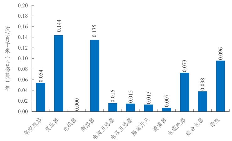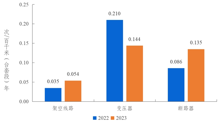 2023年,架空線路的強(qiáng)迫停運(yùn)率為0.054次/百千米年,同比上升0.019次/百千米年。變壓器的強(qiáng)迫停運(yùn)率為0.144次/百臺(tái)年,同比下降0.066次/百臺(tái)年。斷路器的強(qiáng)迫停運(yùn)率為0.135次/百臺(tái)年,同比上升0.049次/百臺(tái)年。