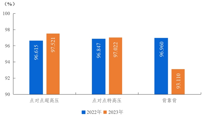2023年,納入電力可靠性統(tǒng)計(jì)的點(diǎn)對(duì)點(diǎn)超高壓直流輸電系統(tǒng)能量可用率為97.521%,同比上升0.906個(gè)百分點(diǎn);點(diǎn)對(duì)點(diǎn)特高壓直流輸電系統(tǒng)能量可用率為97.022%,同比上升0.175個(gè)百分點(diǎn);背靠背直流輸電系統(tǒng)能量可用率為93.110%,同比下降3.850個(gè)百分點(diǎn)。