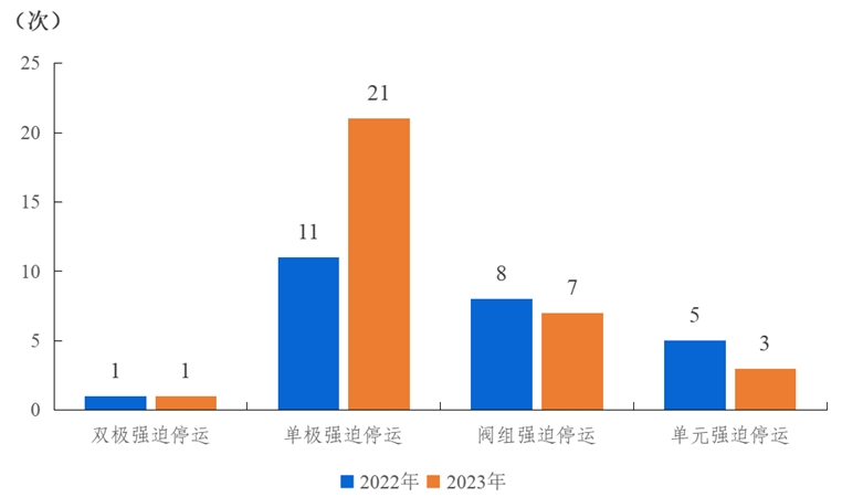 2023年,納入電力可靠性統(tǒng)計(jì)的直流輸電系統(tǒng)發(fā)生32次強(qiáng)迫停運(yùn),其中雙極強(qiáng)迫停運(yùn)1次,與上一年持平;單極強(qiáng)迫停運(yùn)21次,同比增加10次;閥組強(qiáng)迫停運(yùn)7次,同比減少1次;單元強(qiáng)迫停運(yùn)3次,同比減少2次。各系統(tǒng)強(qiáng)迫停運(yùn)的等效停運(yùn)小時(shí)累計(jì)值為383.35小時(shí)。
