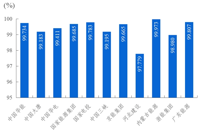 2023年,發(fā)電側(cè)11家集團(tuán)公司變壓器可用系數(shù)前三位分別是廣東省能源集團(tuán)有限公司99.747%、內(nèi)蒙古能源集團(tuán)有限公司99.576%、國(guó)家能源投資集團(tuán)有限責(zé)任公司99.097%。