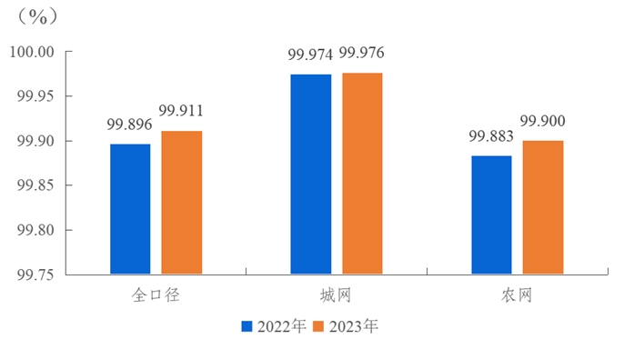 2023年,全國(guó)用戶平均供電可靠率99.911%,同比上升0.015個(gè)百分點(diǎn),其中,城網(wǎng)99.976%,農(nóng)網(wǎng)99.900%。城網(wǎng)與農(nóng)網(wǎng)相差0.076個(gè)百分點(diǎn)。
