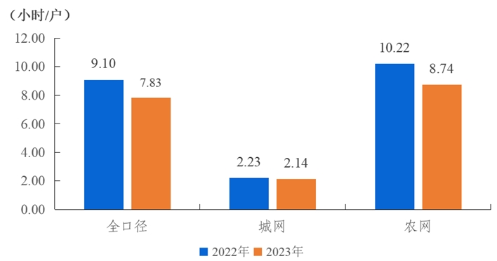 全國(guó)用戶平均停電時(shí)間7.83小時(shí)/戶,同比減少1.27小時(shí)/戶,其中城網(wǎng)2.14小時(shí)/戶,農(nóng)網(wǎng)8.74小時(shí)/戶。城網(wǎng)與農(nóng)網(wǎng)相差6.60小時(shí)/戶。