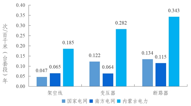 2023年,電網(wǎng)側(cè)3家集團(tuán)公司國(guó)家電網(wǎng)、南方電網(wǎng)、內(nèi)蒙古電力的架空線路強(qiáng)迫停運(yùn)率分別是0.047次/百千米年、0.065次/百千米年和0.185次/百千米年,變壓器強(qiáng)迫停運(yùn)率分別是0.122次/百臺(tái)年、0.064次/百臺(tái)年和0.282次/百臺(tái)年,斷路器強(qiáng)迫停運(yùn)率分別是0.134次/百臺(tái)年、0.115次/百臺(tái)年和0.343次/百臺(tái)年。