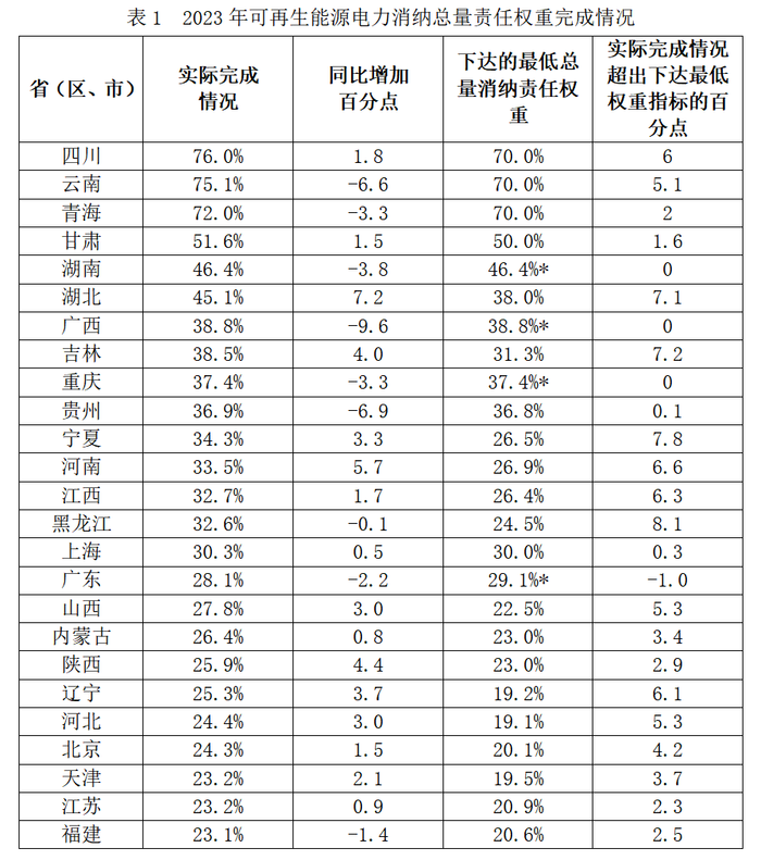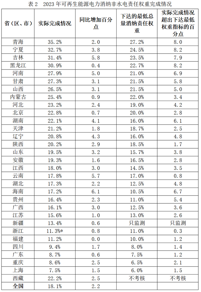 根據(jù)《國家發(fā)展改革委辦公廳 國家能源局綜合司關于2023年可再生能源電力消納責任權重及有關事項的通知》(發(fā)改辦能源〔2023〕569號),綜合考慮各省本地生產、本地利用以及外來電力消納情況,全國各省(自治區(qū)、直轄市)可再生能源電力消納責任權重總體完成較好,具體完成情況如下。