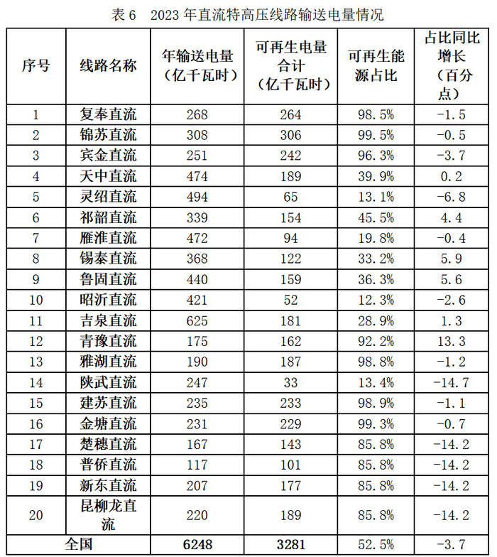 2023年,20條直流特高壓線路年輸送電量6248億千瓦時,其中可再生能源電量3281億千瓦時,同比提高3.6%,可再生能源電量占全部直流特高壓線路總輸送電量的52.5%。國家電網運營的16條直流特高壓線路總輸送電量5537億千瓦時,其中可再生能源電量2672億千瓦時,占總輸送電量的48.3%;南方電網運營的4條直流特高壓線路輸送電量711億千瓦時,其中可再生能源電量610億千瓦時,占總輸送電量的85.8%。