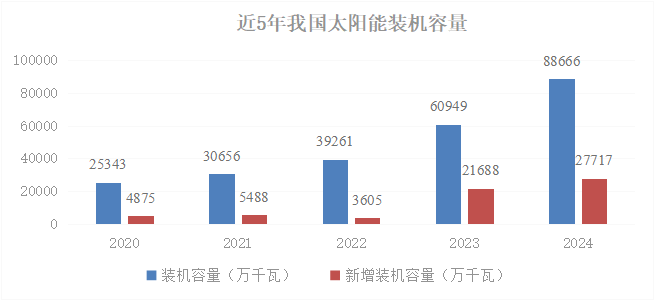 截至2024年末,全國(guó)光伏發(fā)電裝機(jī)容量達(dá)8.86億千瓦,同比增長(zhǎng)45%,排在火電之后,位居第2位,其中集中式光伏5.11億千瓦,分布式光伏3.75億千瓦。全年光伏新增裝機(jī)2.78億千瓦,同比增長(zhǎng)28%,其中集中式光伏1.59億千瓦,分布式光伏1.18億千瓦。全年光伏發(fā)電量達(dá)到8341億千瓦時(shí),同比增長(zhǎng)44%,但仍落后于核電的發(fā)電量,排在第5位。全年發(fā)電利用小時(shí)數(shù)為1211小時(shí),發(fā)電上網(wǎng)利用率96.8%,較上年有所降低。