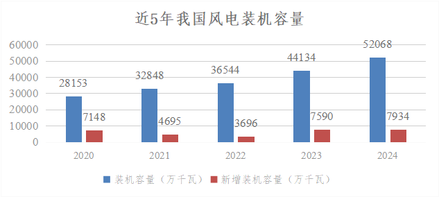 截至2024年末,全國(guó)風(fēng)電累計(jì)并網(wǎng)容量達(dá)到5.21億千瓦,同比增長(zhǎng)18%,其中陸上風(fēng)電4.8億千瓦,海上風(fēng)電4127萬(wàn)千瓦,在全國(guó)電力裝機(jī)中排在第3位。全年新增裝機(jī)容量7982萬(wàn)千瓦,同比增長(zhǎng)6%,其中陸上風(fēng)電7579萬(wàn)千瓦,海上風(fēng)電404萬(wàn)千瓦。從新增裝機(jī)分布看,“三北”地區(qū)占全國(guó)新增裝機(jī)的75%。2024年,全國(guó)風(fēng)電發(fā)電量9916億千瓦時(shí),同比增長(zhǎng)16%,僅次于火電和水電,排在第3位;全年并網(wǎng)發(fā)電利用小時(shí)數(shù)為2127小時(shí),平均上網(wǎng)利用率95.9%。