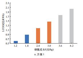 通過兩個方案進(jìn)行燃料電池儲能經(jīng)濟(jì)性評估,均按容量為1 MW 的燃料電池計算,運(yùn)行周期為10 年,固定資產(chǎn)殘值為10%,用氫量為83.5 t/ 年。其中,方案A 為燃料電池發(fā)電,年利用小時數(shù)為2000 h,轉(zhuǎn)化效率為60%,發(fā)電量為200 萬kWh;方案B 為燃料電池?zé)犭娐?lián)供,年利用小時數(shù)為3000 h,轉(zhuǎn)化效率為90%,發(fā)電量為300 萬kWh。兩種方案的不同綠氫成本對應(yīng)的LCOE 如圖3 所示。