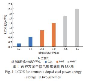 考慮煤電運(yùn)行成本的影響( 煤電運(yùn)行成本隨綠氨成本下降而下降),計算得到兩種方案中不同綠氨成本對應(yīng)的煤電摻氨儲能的LCOE,具體如圖1 所示。
