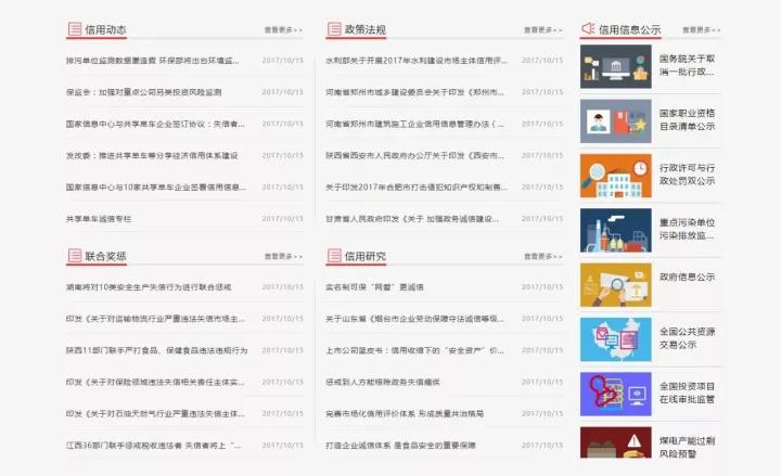 打開新版“信用中國”網(wǎng)站,《中國信用》雜志記者發(fā)現(xiàn)查詢類欄目、資訊類欄目、公示類欄目分區(qū)設(shè)置,更加突出權(quán)威性、及時(shí)性、互動性和可讀性。查詢類欄目包括統(tǒng)一社會信用代碼查詢、行政許可和行政處罰信息查詢、守信紅名單查詢、失信黑名單查詢、重點(diǎn)關(guān)注名單查詢等。資訊類欄目新設(shè)標(biāo)準(zhǔn)規(guī)范、信用公示、聯(lián)合獎懲、專項(xiàng)治理、誠信文化、城市信用、信用刊物、個(gè)人信用、風(fēng)險(xiǎn)提示、信用大數(shù)據(jù)分析等。公示類欄目包括國家職業(yè)資格目錄清單、重點(diǎn)污染單位污染排放監(jiān)測信息、全國公共資源交易信息等十余個(gè)公示專區(qū)。欄目內(nèi)容和信息將即時(shí)更新。